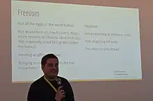 Lightning talks are designed to be short presentations between five and ten minutes long, but are usually capped at five minutes.[4] Most conferences will allot a segment of roughly 30 to 90 minutes long to speakers. Talks are arranged one after the other during the sessions. The talks are usually given at conferences in order for the event to have many speakers discuss a multitude of topics. The conferences are held in order for individuals to be able to share their ideas and concepts to people who have experience in the specific field.[5] Lightning talks are brief which requires the speaker to make their point clearly and rid the presentation of non-critical information. This causes the audience to be more attentive to the speaker and gain a broader array of knowledge from the presentations given.[6]