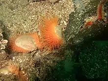 The flame shell resembles a scallop with a bright orange fringe of tentacle-like filaments emerging from between the valve of its shell.