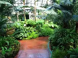 The conservatory consists of a vestibule, four display halls and fifteen propagating and growing houses. The vestibule and Palm House were built and opened to the public in 1892 and contain giant palms and rubber trees, including a 15 m (50 ft) fiddle-leaf rubber tree planted in 1891. The Palm House, has a display of more than twelve different types of palms. The most unusual palms include Dwarf Sugar, Bottle, Fiji Fan, and Everglade palms. Some of the most recognized palms include the pygmy date plan and the coconut palm due to its fruit. Furthermore, this large house also includes plants that produce food: banana plants, a grapefruit tree, orange trees, papaya plants, a coffee tree, and a cacao tree, among others.[8] The Palm House contains Garden Figure, a sculpture by Frederick Hibbard.[9] The Fern Room or Fernery, approximately five and a half feet below grade, was opened in 1895. It contains plants of the forest floor, primarily a vast collection of ferns and one of the most historical plants, the cycads. Fossils of these plants date back at least 250 million years. These plants are similar to conifers and the ginkgo tree rather than palm trees.[8] The Tropical Room was originally called the stove house. Opened in 1895, it contained an assortment of tropical plants suspended from bark-covered walls. It is now called the Orchid Room and has a collection of approximately 25,000 natural species. This room contains hundreds of orchids, bromeliads and a few tropical carnivorous plants. Orchids, just like bromeliads, get their water from the humidity in the room.[8] The Display House or The Show House is used for seasonal flower exhibits. The "Spring Flower Show" starts on January 21 and ends on May 13. Following that show is the "Tropical Summer Show" that starts on June 2 and runs through September 23rd. Finally, the year ends with the "Winter Flow and Train Show" that runs starts on November 24 and ends on January 6.[8]