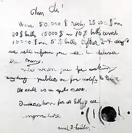 Dear Sir! Have 50.000$ redy 25 000$ in 20$ bills 15000$ in 10$ bills and 10000$ in 5$ bills After 2–4 days we will inform you were to deliver the mony. We warn you for making anyding public or for notify the Police the child is in gut care. Indication for all letters are Singnature and 3 hohls.[12]