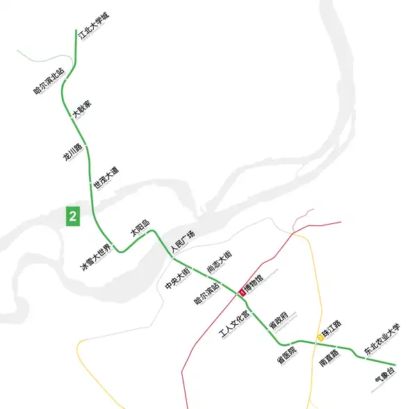 Line 2 of the Harbin Metro (Chinese: 哈尔滨地铁二号线; pinyin: Hārbīn Dìtiě Èr Hào Xiàn) is a rapid transit line in Harbin, running from Jiangbei University Town to Meteorological Observatory. The line is 28.7 km long with 19 stations, all of which are underground. It opened on September 19, 2021.[2][1]