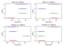 Projections along linear discriminant axes for 4 classes