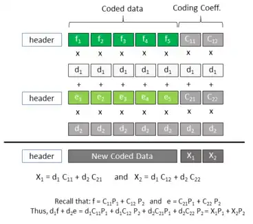 Coding and recoding process in linear network coding. Each packet is seen as a set of elements from a Galois field. Therefore, multiplying and adding two packets means multiplying each of its symbols by a coding coefficient chosen from the Galois field and then adding the two packets together, symbol-wise.