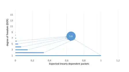 Overhead due to linear dependencies: Since the coding coefficients are chosen randomly in RLNC, there is a chance that some transmitted coded packets are not beneficial to the destination because they are formed using a linearly dependent combination of packets. However, this overhead is negligible in most applications. The linear dependencies depend on the Galois fields' size and are practically independent of the generation size used. We can illustrate this with the following example. Let us assume we are using a Galois field of elements and a generation size of packets. If the destination has not received any coded packet, we say it has degrees of freedom, and then almost any coded packet will be useful and innovative. In fact, only the zero-packet (only zeroes in the coding coefficients) will be non-innovative. The probability of generating the zero-packet is equal to the probability of each of the coding coefficient to be equal to the zero-element of the Galois field. I.e., the probability of a non-innovative packet is of . With each successive innovative transmission, it can be shown that the exponent of the probability of a non innovative packet is reduced by one. When the destination has received innovative packets (i.e., it needs only one more packet to fully decode the data). Then the probability of a non innovative packet is of . We can use this knowledge to calculate the expected number of linearly dependent packets per generation. In the worst-case scenario, when the Galois field used contains only two elements (), the expected number of linearly dependent packets per generation is of 1.6 extra packets. If our generation size if of 32 or 64 packets, this represents an overhead of 5% or 2.5%, respectively. If we use the binary-8 field (), then the expected number of linearly dependent packets per generation is practically zero. Since it is the last packets the major contributor to the overhead due to linear dependencies, there are RLNC-based protocols such as tunable sparse network coding[12] that exploit this knowledge. These protocols introduce sparsity (zero-elements) in the coding coefficients at the beginning of the transmission to reduce the decoding complexity, and reduce the sparsity at the end of the transmission to reduce the overhead due to linear dependencies.