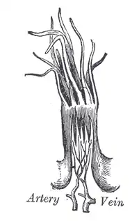 Foliate papillae are short vertical folds and are present on each side of the tongue.[2] They are located on the sides at the back of the tongue, just in front of the palatoglossal arch of the fauces,[4][2] There are four or five vertical folds,[2] and their size and shape is variable.[4] The foliate papillae appear as a series of red colored, leaf–like ridges of mucosa.[2] They are covered with epithelium, lack keratin and so are softer, and bear many taste buds.[2] They are usually bilaterally symmetrical. Sometimes they appear small and inconspicuous, and at other times they are prominent. Because their location is a high risk site for oral cancer, and their tendency to occasionally swell, they may be mistaken as tumors or inflammatory disease. Taste buds, the receptors of the gustatory sense, are scattered over the mucous membrane of their surface. Serous glands drain into the folds and clean the taste buds. Lingual tonsils are found immediately behind the foliate papillae and, when hyperplastic, cause a prominence of the papillae.