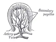 Lingual papillae (singular papilla) are small structures on the upper surface of the tongue that give it its characteristic rough texture. The four types of papillae on the human tongue have different structures and are accordingly classified as circumvallate (or vallate), fungiform, filiform, and foliate. All except the filiform papillae are associated with taste buds.[1]