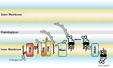 The repetitive glycan polymer contained within an LPS is referred to as the O antigen, O polysaccharide, or O side-chain of the bacteria. The O antigen is attached to the core oligosaccharide, and comprises the outermost domain of the LPS molecule. The composition of the O chain varies from strain to strain; there are over 160 different O antigen structures produced by different E. coli strains.[14] The presence or absence of O chains determines whether the LPS is considered "rough" or "smooth". Full-length O-chains would render the LPS smooth, whereas the absence or reduction of O-chains would make the LPS rough.[15] Bacteria with rough LPS usually have more penetrable cell membranes to hydrophobic antibiotics, since a rough LPS is more hydrophobic.[16] O antigen is exposed on the very outer surface of the bacterial cell, and, as a consequence, is a target for recognition by host antibodies.