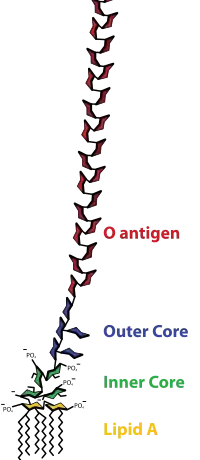 Lipopolysaccharides (LPS) are large molecules consisting of a lipid and a polysaccharide that are bacterial toxins. They are composed of an O-antigen, an outer core, and an inner core all joined by a covalent bond, and are found in the outer membrane of Gram-negative bacteria. Today, the term endotoxin is often used synonymously with LPS,[1] although there are a few endotoxins (in the original sense of toxins that are inside the bacterial cell that are released when the cell disintegrates) that are not related to LPS, such as the so-called delta endotoxin proteins produced by Bacillus thuringiensis.[2]