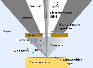 The ability to study liquid samples, particularly those involving water, with electron microscopy has been a wish ever since the early days of electron microscopy [1] but technical difficulties prevented early attempts from achieving high resolution.[2] Two basic approaches exist for imaging liquid specimens: i) closed systems, mostly referred to as liquid cell EM (LC EM), and ii) open systems, often referred to as environmental systems. In closed systems, thin windows made of materials such as silicon nitride or graphene are used to enclose a liquid for placement in the microscope vacuum. Closed cells have found widespread use in the past decade due to the availability of reliable window microfabrication technology.[3][4] Graphene provides the thinnest possible window.[5] The oldest open system that gained widespread usage was environmental scanning electron microscopy (ESEM) of liquid samples on a cooled stage in a vacuum chamber containing a background pressure of vapor.[6][7] Low vapor pressure liquids such as ionic liquids can also be studied in open systems.[8] LP-EM systems of both open and closed type have been developed for all three main types of electron microscopy, i.e., transmission electron microscopy (TEM), scanning transmission electron microscopy (STEM), and scanning electron microscope (SEM).[9] Instruments integrating liquid-phase SEM with light microscopy have also been developed.[10][11] Electron microscopic observation in liquid has been combined with other analytical methods such as electrochemical measurements [3] and energy-dispersive X-ray spectroscopy (EDX).[12]