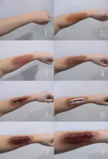 Liquid latex used for special effects makeup projects like scars and gashes incorporate flesh-coloured latex that is applied to the skin and then built up using materials such as tissue paper and cotton.