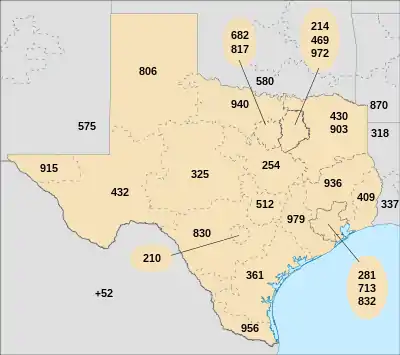 Map of Texas and adjacent regions, with the numbering plan areas of Texas highlighted (tan).