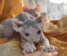 The Elf or Elf Sphynx is a nearly hairless variety with ears that curl backward. The gene responsible for hairlessness in the Sphynx (and thus in the Elf) produces skin that is not completely hairless; two types of hair formation occur: a few patches of light hairs particularly around the nose, tail, and toes; and a fine downy all-over covering.[12] Care issues are as with Sphynx cats. As of 2022, this in-development variety is not recognized by major breed registries and cat-fancier organizations such as The International Cat Association (TICA) or the Cat Fanciers' Association (CFA). Some breeders have published draft breed standards for the Elf, based on those for the foundation breeds, but these documents are not entirely consistent with each other.[13][14][15][16] Breeders are seeking TICA recognition as a preliminary new breed.[17] The Elf has been included in the Australian National Cats (ANCats) breed list as experimental.[14]