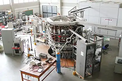 | T-10 (Tokamak-10)[2] | Operational | 1975– | Kurchatov Institute | 1.50 m/0.37 m | 4 T | 0.8 MA | Largest tokamak of its time | ![]() | ||
