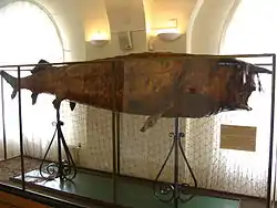 - The largest species of this order is the widely distributed tiger shark (Galeocerdo cuvier). Specimens have been verified to at least 5.5 m (18 ft) but even larger ones have been reported. One specimen, a gravid female caught off Australia and measuring only 5.5 m (18 ft) long, weighed an exceptional 1,524 kg (3,360 lb).[4] A female caught in 1957 reportedly measured 7.4 m (24 ft) and weighing 3,110 kg (6,860 lb), although this very outsized shark is not known to have been confirmed.[31] The largest of the infamous "requiem sharks" (in the genus Carcharhinus) seems to be the dusky shark (C. obscurus), at up to 4.2 m (14 ft) and a weight of 350 kg (770 lb).[32] However, the bulkier bull shark (C. leucas) has been estimated to weigh about 575 kg (1,268 lb) in recent specimens that measured over 4 m (13 ft) long.[33] The silky shark (C. falciformis) is another contender for the largest requiem shark at a maximum weight of 350 kg (770 lb) and a maximum length of around 3.5 m (11 ft). The largest hammerhead shark is the great hammerhead (Sphyrna mokarran), which can reach 6.1 m (20 ft) and weigh 500 kg (1,100 lb).[34] The most species-rich shark family, the catsharks, are fairly small-bodied. The largest, the nursehound (Scyliorhinus stellaris), can grow up to 1.7 m (5.6 ft) and a weight of at least 10.8 kg (24 lb).[35][36]