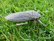 The largest species of this diverse, huge order are the giant water bugs Lethocerus grandis and L. maximus.[28] These can surpass a length of 12 cm (4.7 in),[29] although they are more slender and less heavy than most other insects of this size (principally the huge beetles). The largest cicada is Megapomponia imperatoria, which has a head-body length of about 7 cm (2.8 in) and a wingspan of 18–20 cm (7–8 in).[30][31] The cicadas of the genus Tacua can also grow to comparably large sizes. The largest type of aphid is the giant oak aphid (Stomaphis quercus), which can reach an overall length of 2 cm (0.79 in).[32] The biggest species of leafhopper is Ledromorpha planirostris, which can reach a length of 2.8 cm (1.1 in).[33]