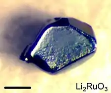 Lithium ruthenate, Li2RuO3, is a chemical compound of lithium, ruthenium and oxygen. It has a layered honeycomb crystal structure, and can be prepared by direct calcination of Ru metal and lithium carbonate at ca. 700 °C.[2] It is a potential lithium-ion battery electrode material,[2] though this application is hindered by the high costs of Ru, as compared to the cheaper Li2MnO3 alternative.[3]