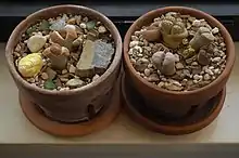 Lithops thrive best in a coarse, well-drained substrate. Any soil that retains too much water will cause the plants to burst their skins as they over-expand. Plants grown in strong light will develop hard strongly coloured skins which are resistant to damage and rot, although persistent overwatering will still be fatal. Excessive heat will kill potted plants as they cannot cool themselves by transpiration and rely on staying buried in cool soil below the surface. Commercial growers mix a mild fungicide or weak strength horticultural sulfur into the plant's water to prevent rotting. Lithops are sensitive to watering during hot weather, which can cause the plants to rot; in habitat the plants are often dormant when the temperatures are high, doing most of their growing during the cool months of the year. Low light levels will make the plants highly susceptible to rotting and fungal infection.[3]
