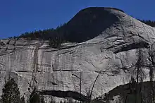 Liberty Cap is a granite dome in Yosemite National Park, California, United States, which lies at the extreme northwestern margin of Little Yosemite Valley. It lies adjacent, to the north of Nevada Fall, on the John Muir Trail at 37°43′43″N 119°31′57″W.[4] It rises 1,700 feet (520 m) feet from the base of Nevada Fall to a peak elevation of 7,076 ft (2,157 m). A smaller, mesa-like dome called Mount Broderick stands immediately adjacent to Liberty Cap. Together, they form a barrier on the north side of the mouth of Little Yosemite Valley.