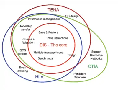 At about the same time, the SIMNET protocol evolved and matured into the Distributed Interactive Simulation (DIS) Standard. DIS allowed an increased number of simulation types to interact in distributed events, but was primarily focused on the platform-level training community. DIS provided an open network protocol standard for linking real-time platform-level wargaming simulations.[10]