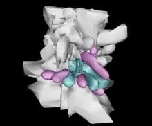 Model of space near the Sun: (grey) Local Bubble, (magenta) molecular clouds, (cyan) Loop I Bubble.