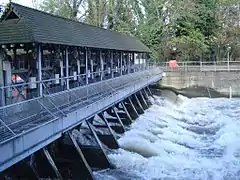 Lock Island is an island in the River Thames in England connected to Shepperton Lock, near Shepperton. Facing the attached by lock-gate bridge mainland is a hedge-lined lawn hosting a café, below and above zones of free short-stay moorings. The Thames River Police have a station on the island. Shepperton Canoe Club and Weybridge Mariners' Boat Club face part of the Weybridge side. The island is connected to Hamhaugh Island by a walkway across the main weir, in turn having a closed-access weir to Hamm Court, Addlestone.