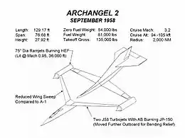 - 21 April 1958: Kelly Johnson makes first notes on a Mach-3 aircraft, initially called the U-3, but eventually evolving into Archangel I. Kelly noted in his A-12 diary, "I drew up the first Archangel proposal for a Mach 3.0 cruise airplane having a 4,000 nmi [4,600 mi; 7,400 km] range at 90,000 to 95,000 ft [27,000 to 29,000 m]".[51]