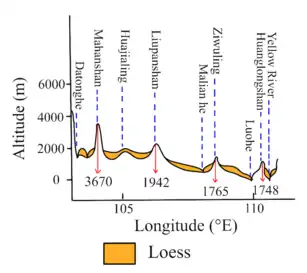 Both the thickness and the size of loess decrease from northwest to southeast.[1][16] The figure shows the topography of the Chinese Loess Plateau. The loess near the Liu-p’an Mts is the thickest which is around 200 m to 300 m while the loess near the Yellow River is around 100 m thick.[1] This is related to the sorting by wind. When the monsoon wind and dust storm are blown from the northwest, it carries the loess of different sizes. When it arrives at the Loess Plateau, the energy of the wind starts to decrease, so it drops the largest and heaviest loess first. It continues to move towards the southeast of the Loess Plateau, the energy of the wind keeps decreasing. Therefore, the finest loess materials are deposited at the southeast end of the Plateau. That is why the coarsest loess is at the northwest of the Loess Plateau while the finest is at the southeast.[16]