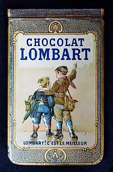 Lombart claimed to be the first chocolate company in France.[1] Experiments in France with pressing out cocoa butter date back to at least 1760.[1] One of the labels of the "Lombert" brand of chocolates dates its use from 1760.[2] This was ten years before Pelletier et Pelletier founded a chocolate factory in 1770.[1] The illustrious clients included Madame Victoire, and then Marie-Thérèse, Duchess of Angoulême, also known as Madame Royale. The company produced superior chocolates, fine sweets, chocolate fantasies and Lombart tea.[3] An old box from the Maison Chocolat Lombart is decorated with two medallions recording patents granted by King Louis XVI and later by the Duchess of Angoulême in 1814. The wooden box closed with an iron hook and was lined with fabric. The label shows that the box held chocolate tablets containing nougat cream and priced at 5 centimes per tablet.[4]