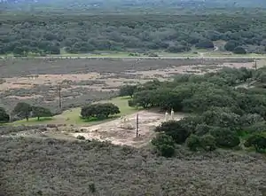 Climate in the region is Mediterranean, with cool, rainy winters and dry summers during which the heat is greatly diminished by fog and northwesterly winds from the cold waters of the Pacific Ocean, which is about 12 miles (19 km) west of the field. Prevailing winds year-round are from the west-northwest. The north slopes of the hills contain stands of bishop pine as well as coast live oak forest; the south-facing slopes have mostly chaparral vegetation types, including coastal sage scrub.[3] Fourteen inches (36 cm) of rain falls in a typical winter. Drainage on the south side of the hills is to the Santa Ynez River, and then out to the sea via Lompoc; to the north, runoff goes to San Antonio Creek, which exits to the ocean through Vandenberg Space Force Base.