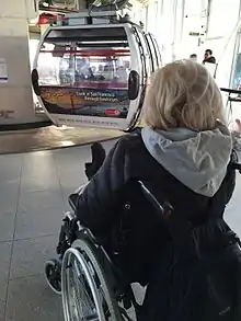 There are 36 passenger gondolas, of which 34 are in use at any one time, with a maximum capacity of 10 passengers each.[35] All passenger gondolas are ready for disabled persons using wheelchairs, including those ones with leg rest extensions. There are also two (open) engineers' gondolas for use by maintenance staff.