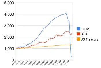 LTCM was initially successful, with annualized returns (after fees) of around 21% in its first year, 43% in its second year and 41% in its third year. However, in 1998 it lost $4.6 billion in less than four months due to a combination of high leverage and exposure to the 1997 Asian financial crisis and 1998 Russian financial crisis.[4] The master hedge fund, Long-Term Capital Portfolio L.P., collapsed soon thereafter, leading to an agreement on September 23, 1998, among 14 financial institutions for a $3.65 billion recapitalization under the supervision of the Federal Reserve.[1] The fund was liquidated and dissolved in early 2000.[5]
