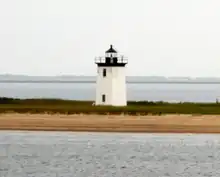 Long Point Light Station is a historic lighthouse at the northeast tip of Long Point in Provincetown, Massachusetts.[3] As a navigational aid, it marks the southwest edge of the entrance to Provincetown Harbor. The United States Coast Guard Light List describes it simply as a "white square tower".[3] The light it casts is green, occulting every 4 seconds, and, at a focal height of 35.5 feet (10.8 m) above mean sea level, has a visible range of 8 nautical miles (15 km; 9.2 mi). When the weather affords low-visibility, one can hear the station's fog horn – sounding a single blast for two seconds, and repeating every 15 seconds – as it seems to call out for (and answer calls from) its nearly-identical closest neighbor, the Wood End Light.[note 1]
