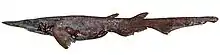 The longhead catshark or smoothbelly catshark (Apristurus longicephalus) is a species of catshark, family Scyliorhinidae, with a patchy distribution in the Indo-Pacific from Mozambique to southern Japan to northern Australia. It is found in water between 500 and 1,140 m (1,640 and 3,740 ft) deep. This species grows to 59 cm (23 in) long and is characterized by its extremely long and narrow snout, short abdomen, and long anal and caudal fins. In addition, a large area of the anterior ventral portion of its body lacks dermal denticles. The longhead catshark is oviparous and the only known cartilaginous fish that is normally hermaphroditic, with the majority of individuals having both the functional reproductive organs of one sex and the undeveloped reproductive organs of the opposite sex.