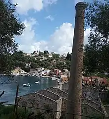 Longos is situated on the northeast coast of the island, and has a small fishing harbour. There are several shops and bars. At one end of Longos harbour stands the tall chimney from an abandoned soap factory. There are several shingle beaches nearby.