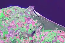 Stotfield, the first significant settlement (discounting Kinneddar which has now disappeared), lies to the north west of the town. Next was the Seatown – a small area between the river and the canal inholding of 52 houses, 51 of which are the historic fisher cottages. When the new harbour was built on the River Lossie, the 18th-century planned town of Lossiemouth, built on a grid system, was established on the low ground below the Coulard Hill. Branderburgh formed the final development during the 19th century. This part of the town developed entirely as a result of the new harbour with its two basins, and eventually covered the entire Coulard Hill; it has an impressive profile when seen from a distance.