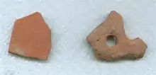 Lothal was one of the most important centres of production for shell-working, owing to the abundance of chank shell of high quality found in the Gulf of Kutch and near the Kathiawar coast.[32] Gamesmen, beads, unguent vessels, chank shells, ladles and inlays were made for export and local consumption. Components of stringed musical instruments like the plectrum and the bridge were made of shell.[34] An ivory workshop was operated under strict official supervision, and the domestication of elephants has been suggested. An ivory seal, and sawn pieces for boxes, combs, rods, inlays and ear-studs were found during excavations.[34] Lothal produced a large quantity of gold ornaments—the most attractive item being microbeads of gold in five strands in necklaces, unique for being less than 0.25 millimetres (0.010 inches) in diameter. Cylindrical, globular and jasper beads of gold with edges at right angles resemble modern pendants used by women in Gujarat in plaits of hair. A large disc with holes recovered from a sacrificial altar is compared to the rukma worn by Vedic priests. Studs, cogwheel and heart-shaped ornaments of faience and steatite were popular in Lothal. A ring of thin copper wire turned into double spirals resembles the gold-wire rings used by modern Hindus for weddings.[35]