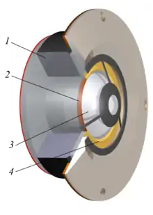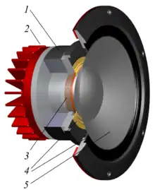 Cutaway view of a dynamic loudspeaker for the bass register.