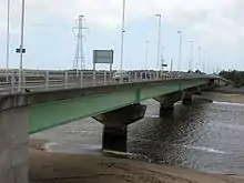 The Loughor bridge is a road bridge crossing over the River Loughor, providing a convenient link between much of western Swansea and Llanelli, west Wales. The bridge is part of the A484 road. The road bridge is adjacent to the Loughor railway viaduct. A permanent bridge linking Loughor and Llanelli was first constructed in 1923. Evidence of the old bridge can still be seen from the right side of the new bridge crossing from loughor, a parapet jutting out into the river which is now a seating area and support foundations can also be seen in the river bed at low tides.
