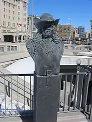 Frontenac's coat of arms marks the entrance to the Château, part of which lies on the site of his former home. Some claim to have spotted him, dressed in 17th century garb, wandering the halls or floating through the ballroom.[27]