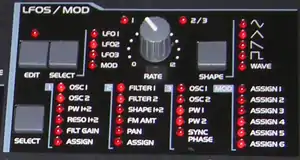 Low-frequency oscillation (LFO) is an electronic frequency that is usually below 20 Hz and creates a rhythmic pulse or sweep. This is used to modulate musical equipment such as synthesizers to create audio effects such as vibrato, tremolo and phasing.[1]