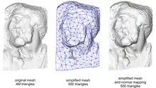 Polygon meshes are one of the major methods of modelling a 3D object for display by a computer. Polygons can, in theory, have any number of sides but are commonly broken down into triangles for display. In general the more triangles in a mesh the more detailed the object is, but the more computationally intensive it is to display. In order to decrease render times (i.e. increase frame rate) the number of triangles in the scene must be reduced, by using low poly meshes.[2]