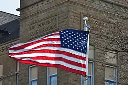 Lucas County's first courthouse was constructed of oak logs in 1850. The 1½-story building was built for $374, and paid for from the Chariton town lot fund.[3][4] It measured 22 by 18 feet (6.7 by 5.5 m) and lime and sand filled the space between the logs. The second courthouse was a 50-square-foot (4.6 m2) building that cost between $15,000 and $20,000 to build. Its foundation was made of logs. After ten years multiple cracks appeared in the logs and Judge Guard ordered the sheriff to secure a church for court proceedings. As the building did not collapse, court returned to the courthouse for several more years. The present courthouse was approved by county voters in 1885. It was completed in 1894, and the clock in the tower has been in operation since then.[5]