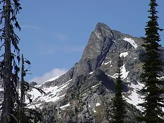Lucifer Peak is a 2,726-metre (8,944-foot) mountain summit located in the Valhalla Ranges of the Selkirk Mountains in southeast British Columbia, Canada. It is situated in western Valhalla Provincial Park, 8.8 km (5.5 mi) west-northwest of Gladsheim Peak, 18 km (11 mi) west of Slocan Lake, and 20 km (12 mi) west-northwest of Slocan. This peak's name was officially adopted July 26, 1977, by the Geographical Names Board of Canada.[3] The peak is located in Devils Range, which is a subrange of the Valhallas. The names of the peaks of this small compact range have a devil-related theme: Black Prince Mountain, Mount Mephistopheles, Devils Dome, Mount Diablo, Satan Peak, Devils Spire, and Devils Couch. Based on the Köppen climate classification, Lucifer Peak has a subarctic climate with cold, snowy winters, and mild summers.[4] Temperatures can drop below −20 °C with wind chill factors below −30 °C. Precipitation runoff from the mountain drains into Gwillim Creek and Evans Creek, both tributaries of the Slocan River. The first ascent of the peak was made August 24, 1970, by Bob Dean and Howie Ridge via the east ridge.[1]