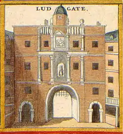 Ludgate was rebuilt in 1586 to the design of William Kerwin; niches in the facade were furnished with statues of Queen Elizabeth I and King Lud with his two sons;[13] these statues replaced medieval ones that had been defaced by Protestant iconoclasts during the reign of King Edward VI. The gateway was finally demolished in 1760 at the request of the local citizens.[12] It was still in use as a debtor's prison, so the inmates were transferred to the City workhouse in Bishopsgate.[14] The statues from the facade were preserved at the Church of St Dunstan-in-the-West in Fleet Street. When the church was rebuilt in 1831, they were sold and taken to Hertford Villa in Regent's Park, but were returned to the church in 1935. Elizabeth's statue now stands in a niche over the vestry door, while the others are inside the porch.[13]