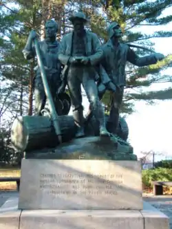 Lumberman's Monument is a monument dedicated to the workers of the early logging industry in Michigan. Standing at 14 feet, the bronze statue features a log surrounded by three figures: a timber cruiser holding a compass, a sawyer with his saw slung over his shoulder, and a river rat resting his peavey on the ground. The granite base of the statue is engraved with a memorial that reads "Erected to perpetuate the memory of the pioneer lumbermen of Michigan through whose labors was made possible the development of the prairie states."[1] It is also inscribed with the names of the logging families who dedicated their time and efforts to the industry in the area. It was built in 1931, dedicated in 1932 and is managed by the USDA Forest Service.[2] It is located in the northeastern part of the Lower Peninsula of Michigan along the Au Sable River within Huron-Manistee National Forests. Access to the park is on River Road, which intersects M-65 west of Oscoda, Michigan. Monument Road, from East Tawas, also leads directly to the monument, which is in Oscoda Township in Iosco County. The monument is part of the River Road Scenic Byway, a 22-mile (35 km) drive between Oscoda and South Branch that runs parallel with the beautiful Au Sable River. It is a designated National Scenic Byway.[3]