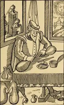 Another use for lute was to act as a safety valve, preventing the buildup of vapour pressure from shattering a vessel and possibly causing an explosion. For this purpose, a hole was bored in the flask and covered with luting material of a particular composition, which was kept soft so that excessive buildup of vapour would cause it to come away from the vessel, thus releasing the pressure safely. This process could also be performed manually by the operator removing and reaffixing the lute as required. Lute was also used to effect repairs to cracked glass vessels.[3] In The Alchemist’s Experiment Takes Fire, 1687, one alembic is exploding; the luting used to seal a receiving bottle to another alembic can be seen behind the alchemist's upraised arm.