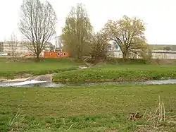 ![]() Mouth of the Lutter into the Leine; behind the trees is the Göttingen sewage farm | |