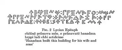 The Lycian language (𐊗𐊕𐊐𐊎𐊆𐊍𐊆 Trm̃mili)[2] was the language of the ancient Lycians who occupied the Anatolian region known during the Iron Age as Lycia. Most texts date back to the fifth and fourth century BC. Two languages are known as Lycian: regular Lycian or Lycian A, and Lycian B or Milyan. Lycian became extinct around the beginning of the first century BC, replaced by the Ancient Greek language during the Hellenization of Anatolia. Lycian had its own alphabet, which was closely related to the Greek alphabet but included at least one character borrowed from Carian as well as characters proper to the language. The words were often separated by two points.