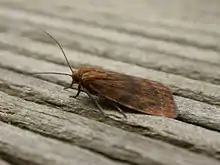 The wingspan is about 20 mm. Adults are dark yellow, with a number of dark brown zigzag lines across each forewing, and a broad black margin to each hindwing.