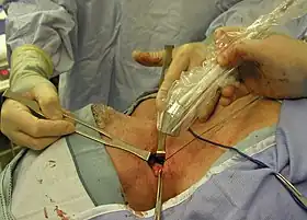 Lymphadenectomy, or lymph node dissection, is the surgical removal of one or more groups of lymph nodes.[1] It is almost always performed as part of the surgical management of cancer. In a regional lymph node dissection, some of the lymph nodes in the tumor area are removed; in a radical lymph node dissection, most or all of the lymph nodes in the tumor area are removed.[2][3][4]